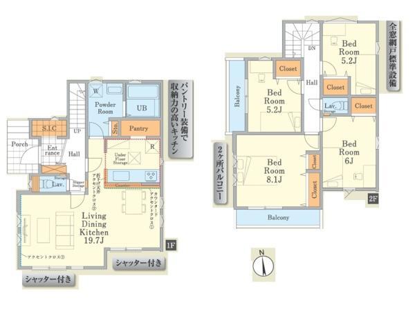 | 備考 | 地盤調査書有;階建 2階建;日当り良好;LDK広さ 18帖以上;ガス 都市ガス;フローリング;複層ガラス;駐車可能台数 2台可;24時間換気システム;全居室収納;クローゼット;シューズインクローゼット;床下収納;システムキッチン;ガスコンロ;コンロ口数 三口;パントリー;食器洗乾燥機;浄水器;独立洗面台;シャンプードレッサー;オートバス;追い焚き;浴室乾燥機;トイレ2ヶ所;温水洗浄便座;バルコニー バルコニー有;全居室複層ガラス;TVインターホン;火災警報器(報知機);小学校 徒歩10分以内備考_80文字:カースペース2台分有(車種による) 物件シート備考:カースペース2台分有(車種による) 備考_300文字:カースペース2台分有(車種による) コピー元備考:カースペース2台分有(車種による) | ||