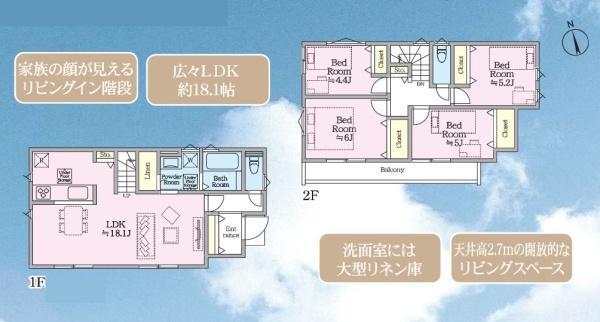 | 備考 | 地盤調査書有;前道6m以上;2沿線以上利用可;階建 2階建;LDK広さ 18帖以上;上水道 公営;汚水 下水道;フローリング;全居室フローリング;複層ガラス;駐車可能台数 2台可;リビング階段;24時間換気システム;全居室収納;クローゼット;シューズボックス;床下収納;システムキッチン;カウンターキッチン;ガスコンロ;コンロ口数 三口;食器洗乾燥機;浄水器;独立洗面台;シャンプードレッサー;オートバス;追い焚き;浴室に窓;浴室乾燥機;トイレ2ヶ所;温水洗浄便座;バルコニー バルコニー有;南面バルコニー;全居室複層ガラス;TVインターホン;火災警報器(報知機)備考_80文字:5棟(2号棟) カースペース2台分有(車種による) 物件シート備考:5棟(2号棟) カースペース2台分有(車種による) 備考_300文字:5棟(2号棟) カースペース2台分有(車種による) コピー元備考:5棟(2号棟) カースペース2台分有(車種による) | ||