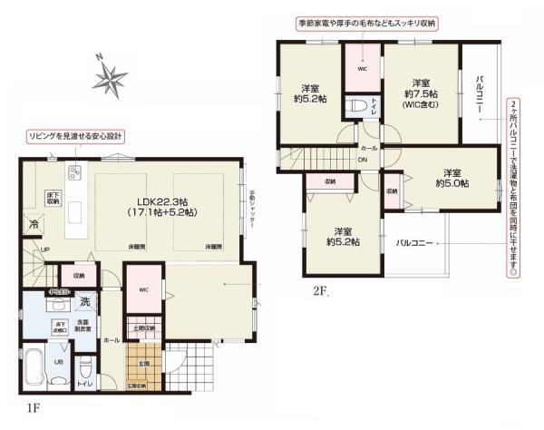 | 備考 | 地盤調査書有;2沿線以上利用可;階建 2階建;全室2面採光;LDK広さ 20帖以上;上水道 公営;汚水 下水道;ガス 都市ガス;フローリング;全居室フローリング;複層ガラス;駐車可能台数 2台可;リビング階段;24時間換気システム;床暖房;クローゼット;ウォークインクローゼット;シューズボックス;床下収納;システムキッチン;カウンターキッチン;ガスコンロ;コンロ口数 三口;浄水器;独立洗面台;シャンプードレッサー;オートバス;追い焚き;浴室に窓;浴室暖房;浴室乾燥機;トイレ2ヶ所;温水洗浄便座;バルコニー 2面バルコニー;全居室複層ガラス;TVインターホン;火災警報器(報知機);小学校 徒歩10分以内備考_80文字:カースペース2台分有(車種による) 物件シート備考:カースペース2台分有(車種による) 備考_300文字:カースペース2台分有(車種による) コピー元備考:カースペース2台分有(車種による) | ||