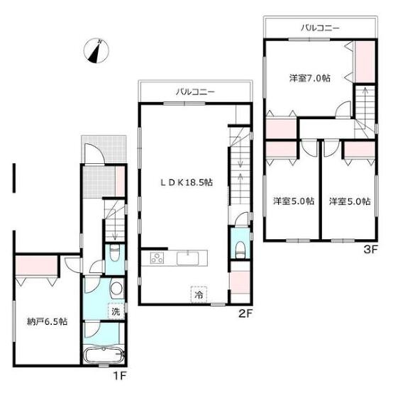 2階 18.5帖 3階洋室 7帖 3階洋室 5帖 3階洋室 5帖 |