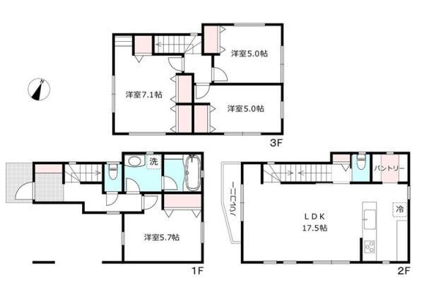 2階 17.5帖 3階洋室 7.1帖 3階洋室 5帖 3階洋室 5帖 |