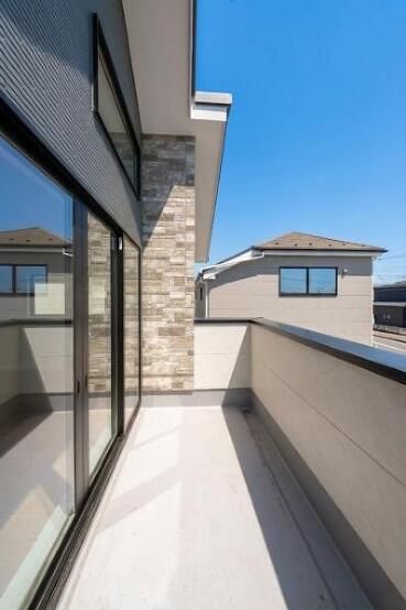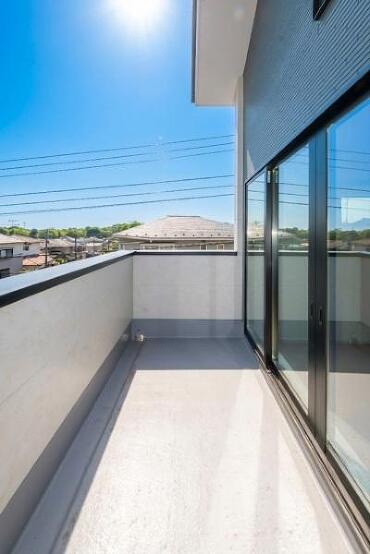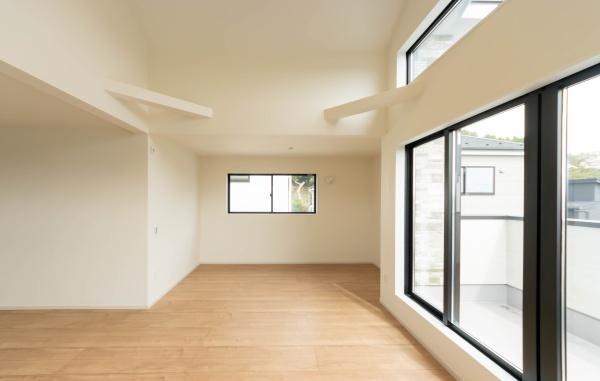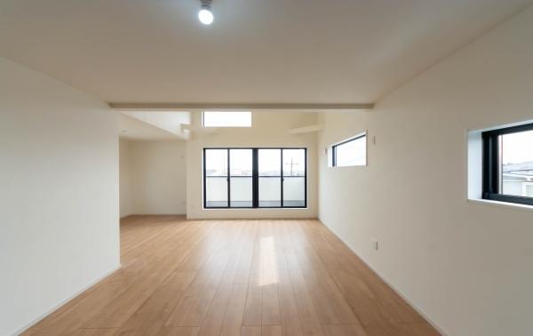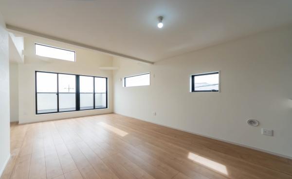 家族がゆったり過ごせる広々リビング。天井部は吹抜で開放感溢れます。陽光溢れる南バルコニー付。
