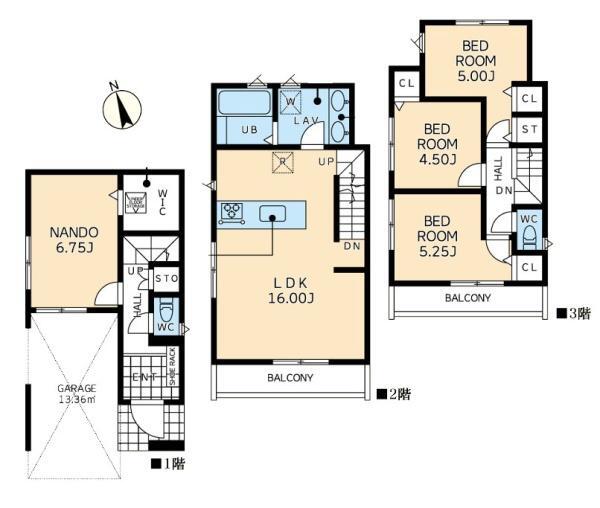 全3棟(1号棟) 建物面積に車庫面積13.36平米含む