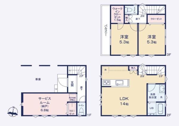 2階 14帖 3階洋室 5.3帖 3階洋室 5.3帖 |