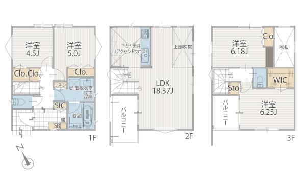 1階洋室 5帖 2階 18.3帖 3階洋室 6.1帖 3階洋室 6.2帖 |