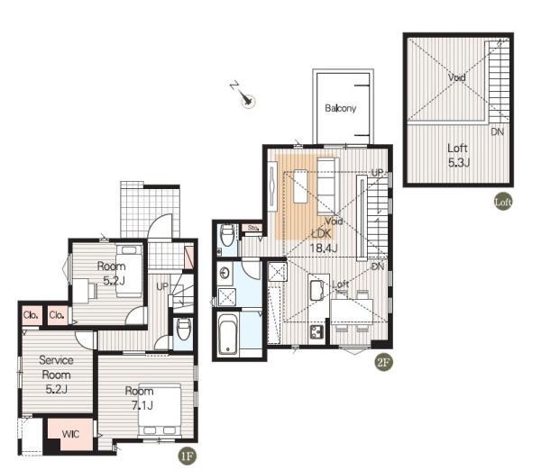 1階 5.2帖 1階洋室 7.1帖 2階 18.4帖 |